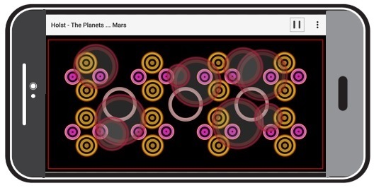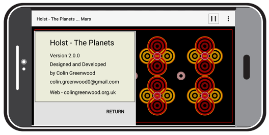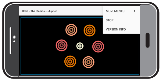 The core screen is the display of images that are animated and appears when the app is run. When the app is started the first movement of Holst, The Planets, entitled Mars, the Bringer of War is played. The playing of this and subsequent movements results in Holst's music being played together with an abstract display that is displayed on the Android device's display screen.