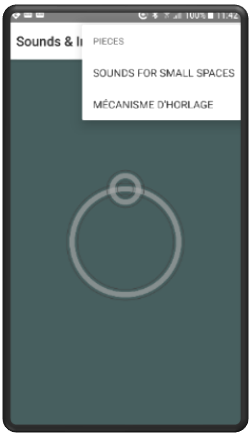 The core screen is the display of images that are animated and appears when the app is run. When the app is started the musical piece, Sounds for Small Spaces, is started. This piece by Kevin Buckland, is currently the first and default piece on the app. There are currently two pieces on the app, the second being Mëcanisme D'Horlage. The playing of Sounds for Small Spaces is played together with an abstract display that is displayed on the Android device's display screen.